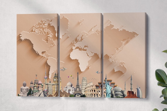 Bronze World Map With Monuments 3D Effect Leather Print/large